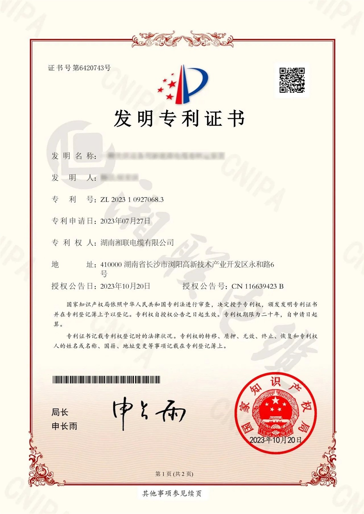 近期,經國家知識產權局審核批準,湘聯電纜再次獲得4項發明專利和2項實用新型專利授權,本次專利的申報類別廣泛,涉及電線電纜的保護、檢測、防爆等技術應用,對線纜的精益生產制造具有重要作用。